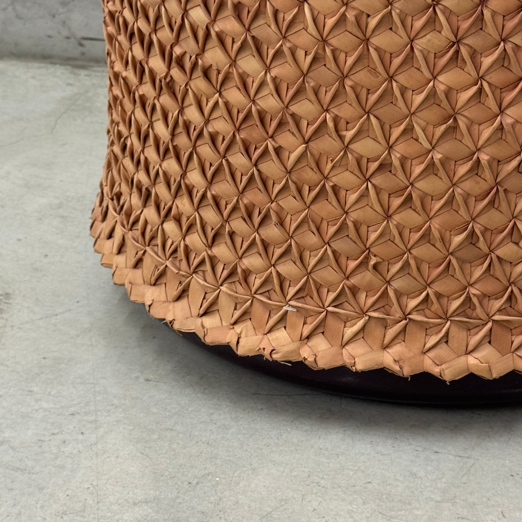鏡面のように仕上げられた木構造と、伝統的なチークの葉による染色で自然な色合いを生み出したパルミラ椰子の手織り、さらにインドネシアの伝統織物を用いた座面が融合したプフ。精緻なレイヤー構造と継ぎ目のない仕上げ、素材への徹底した配慮により、彫刻的な存在感を持つシーティングへと昇華されています。高度な技術、テキスタイルの伝統、そして現代的なデザインが、深い文化的背景とともに結実したプロダクトです。